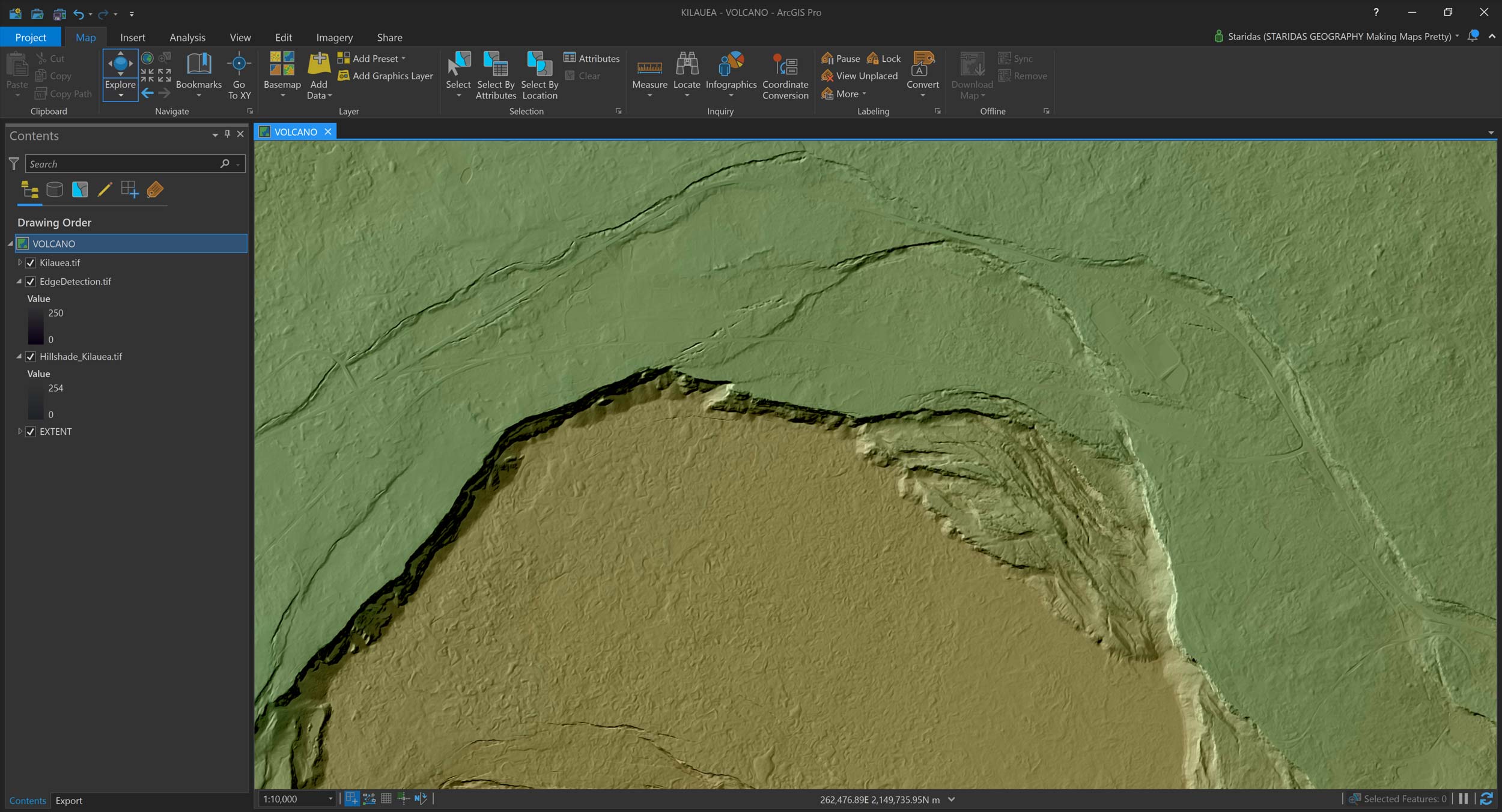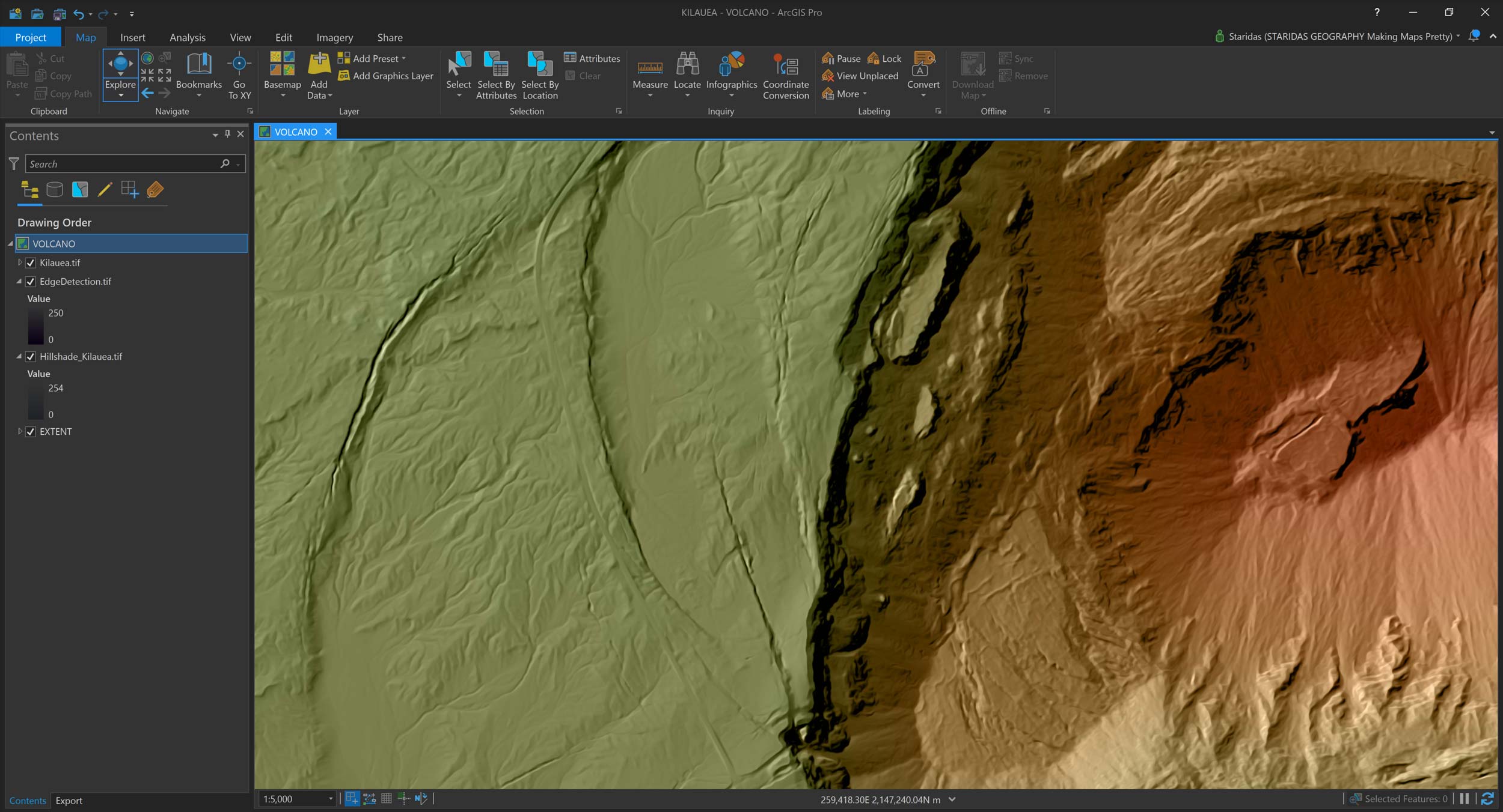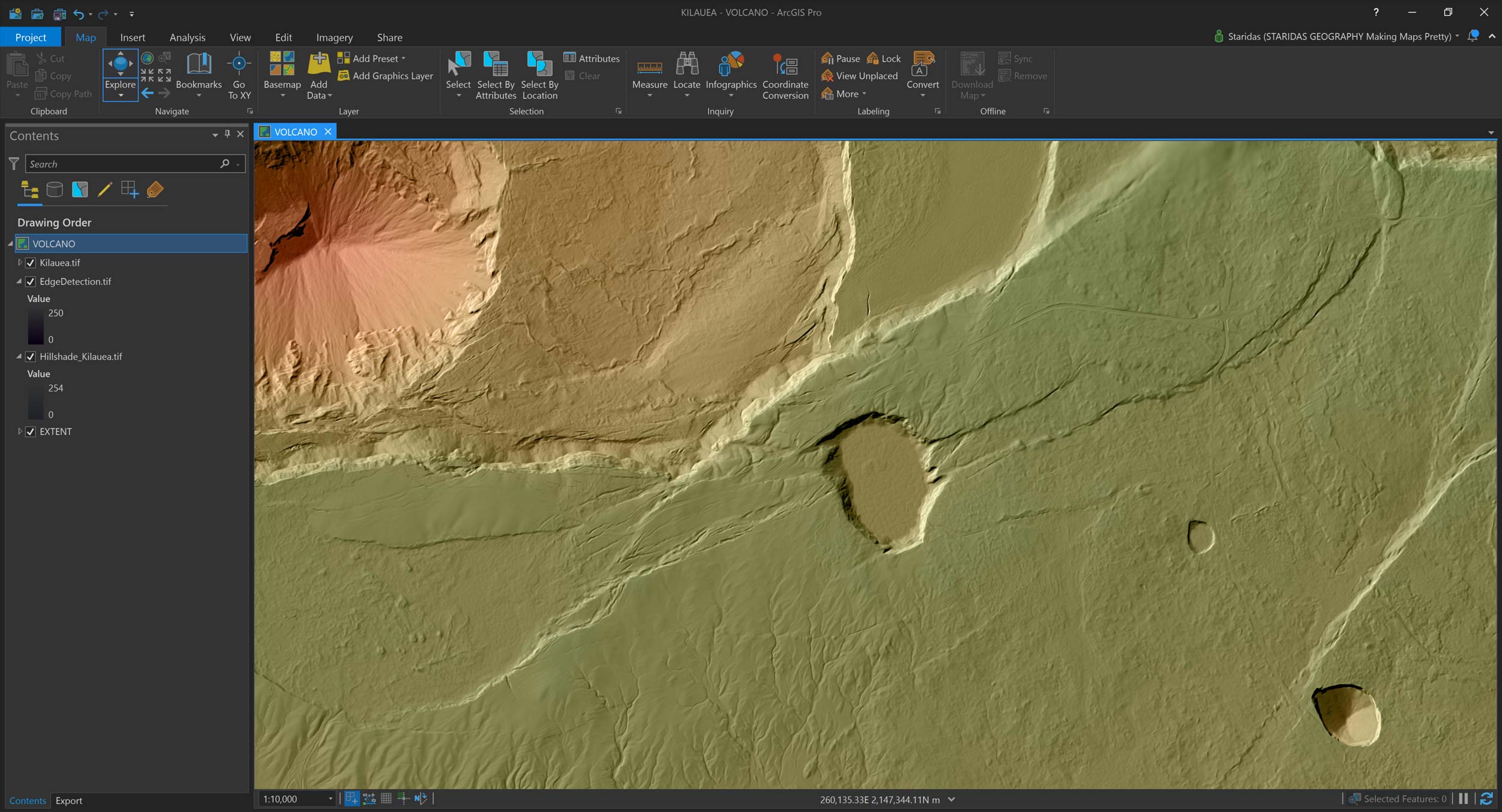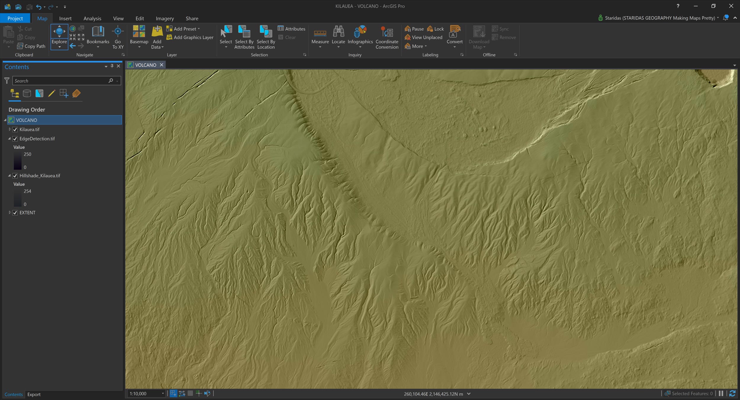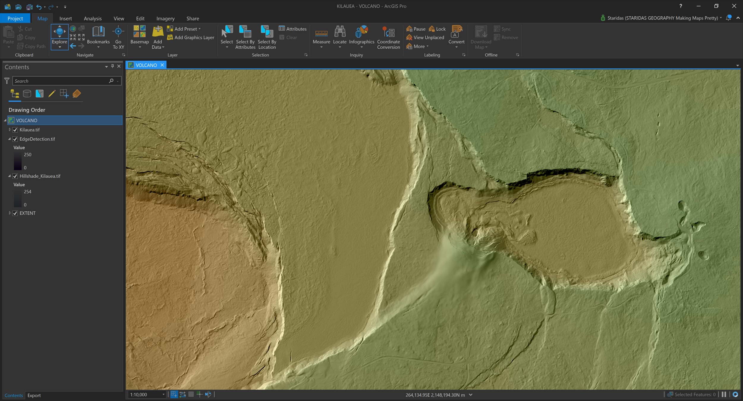 Let’s put this on practise! I start a new project in ArcGIS Pro and I load the DEM of Kilauea volcano on my map (Picture 1).