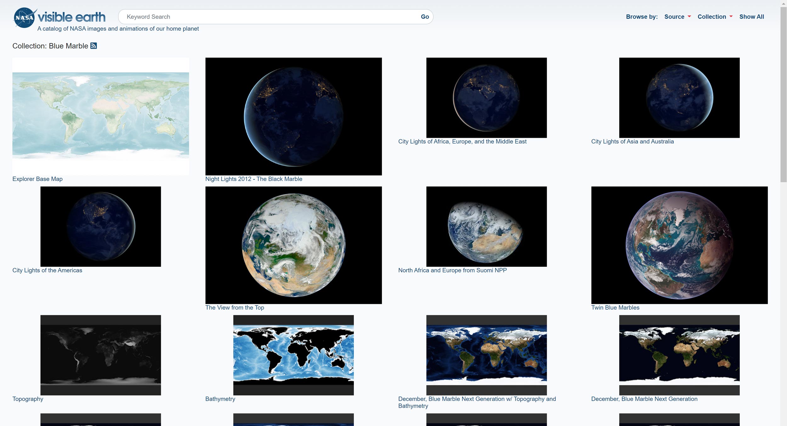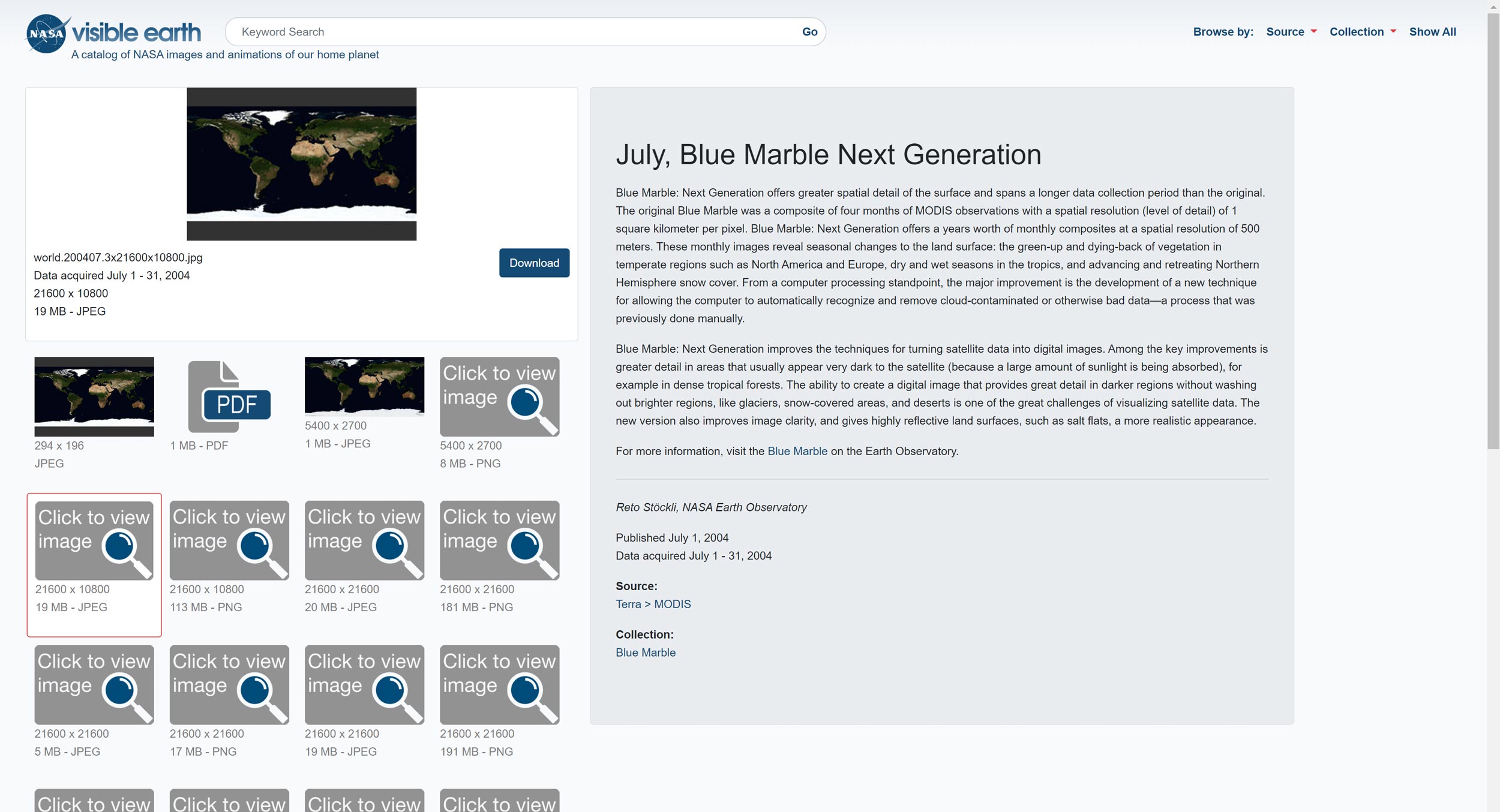 NASA maintains visible earth, a catalog of images and animations of our home planet, as they state on their headline. Among the various and numerous collections, they provide Blue Marble, a series of small scale satellite imagery of the whole World, categorized by month and by context (see Picture 1). More on the taxonomy and context here.