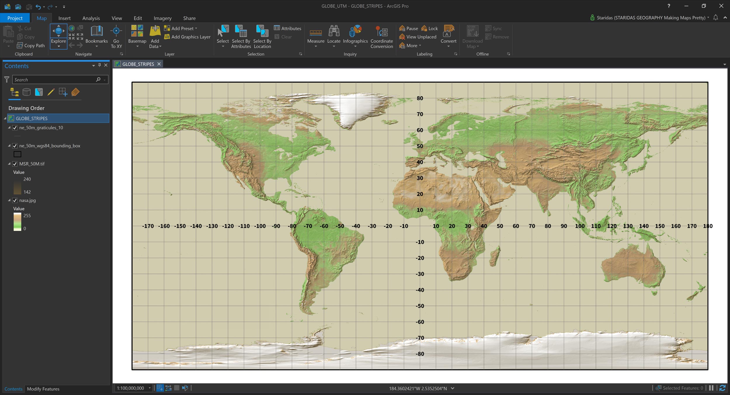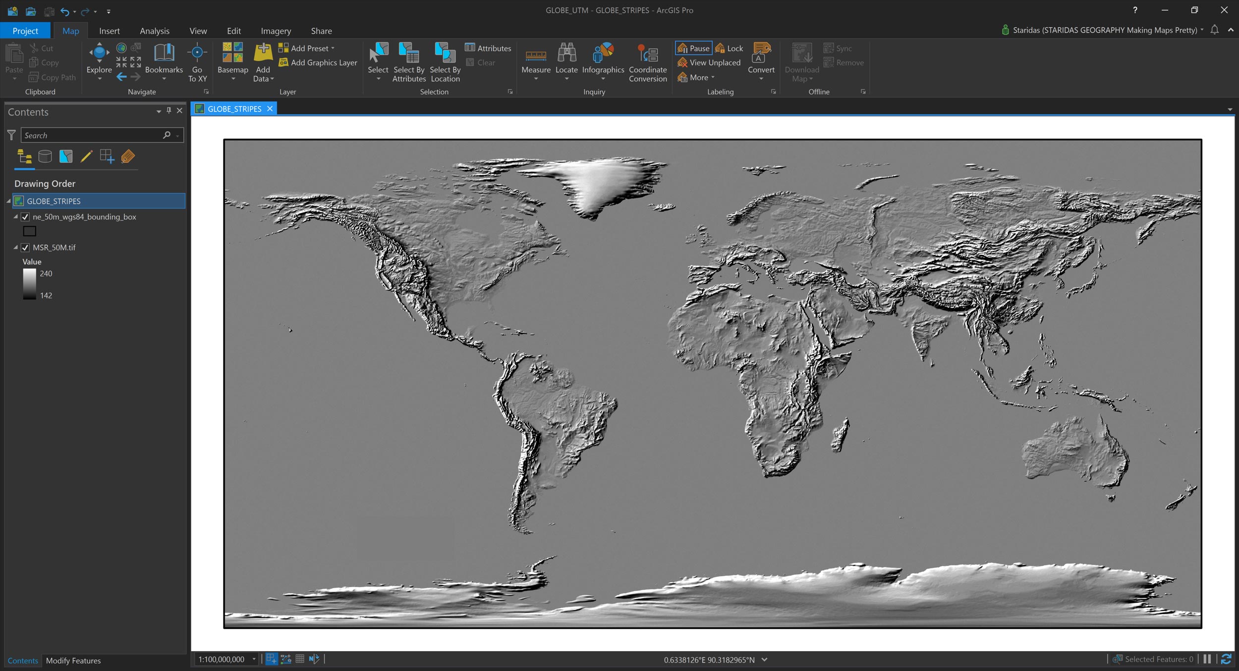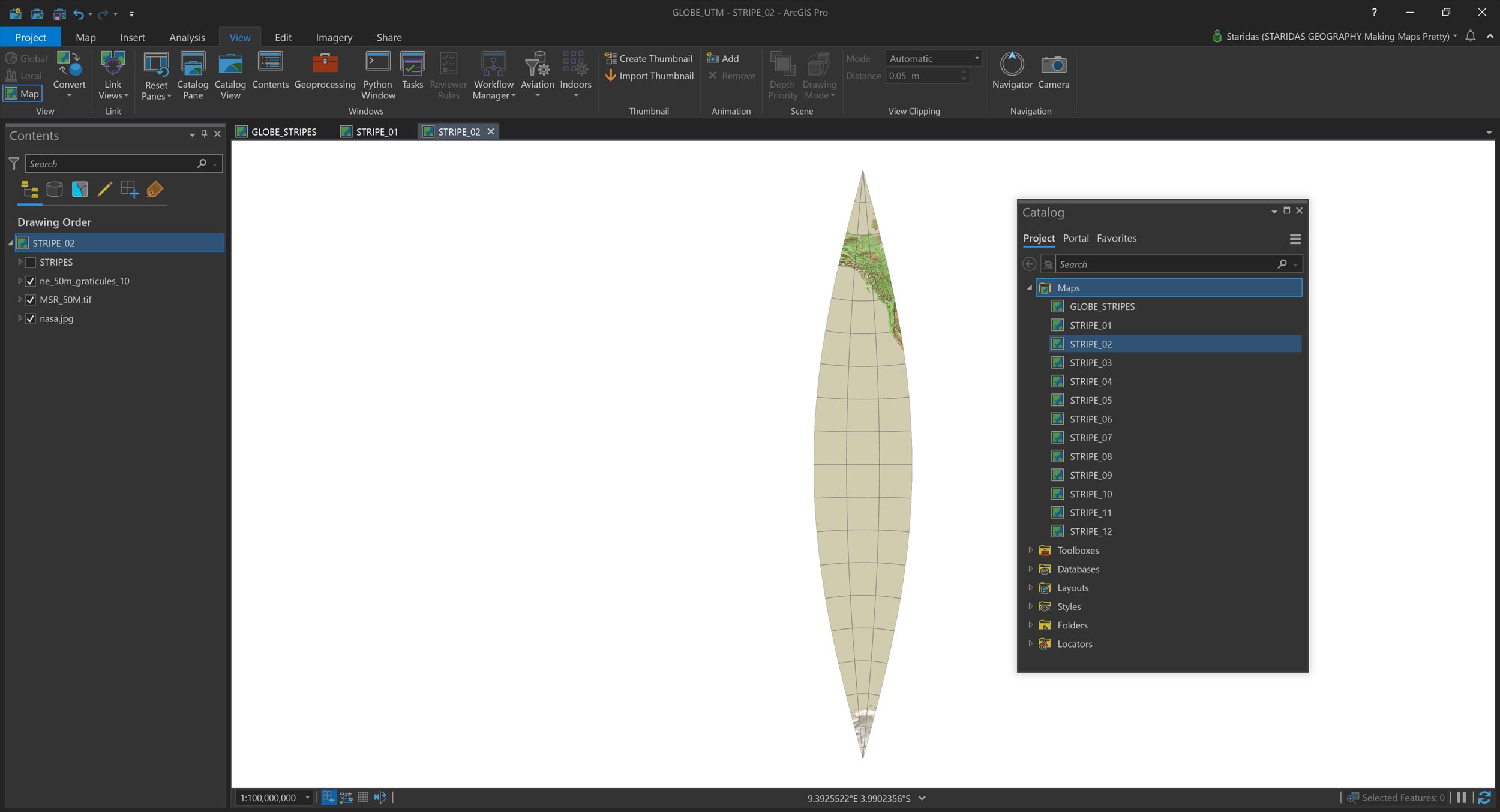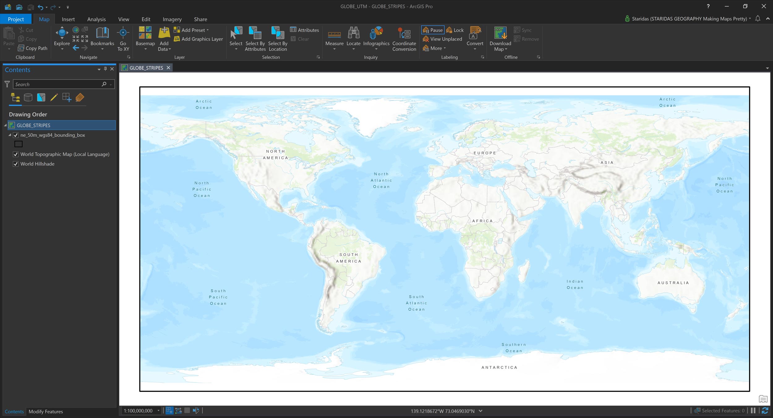 In ArcGIS Pro I create a new map which I rename to GLOBE_STRIPES. It will serve as the environment where I will prepare, process and create all necessary data. I turn the map projection to World Geodetic System 1984 (epsg:4326) and I load the World Bounding Box (Picture 5).
