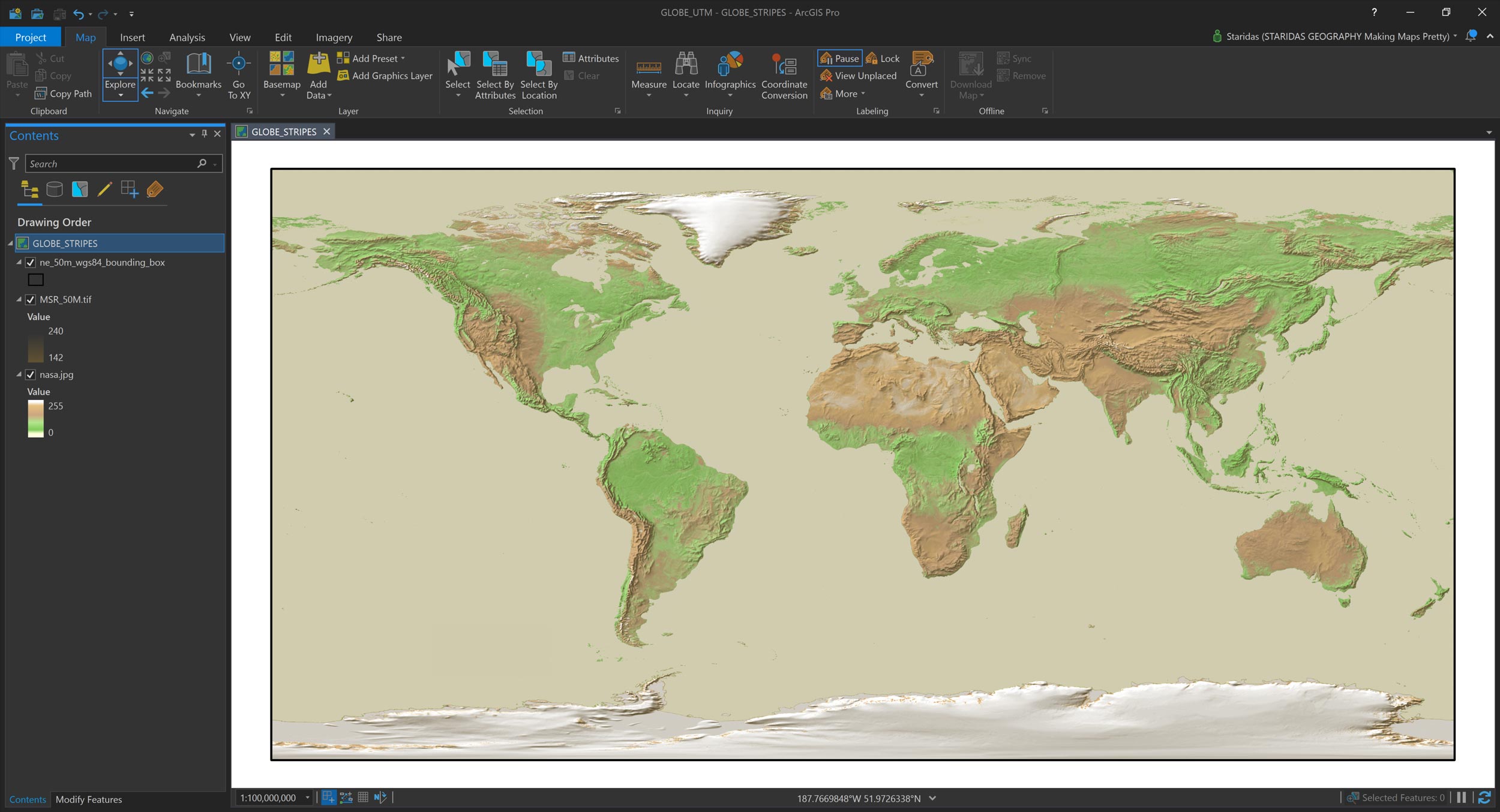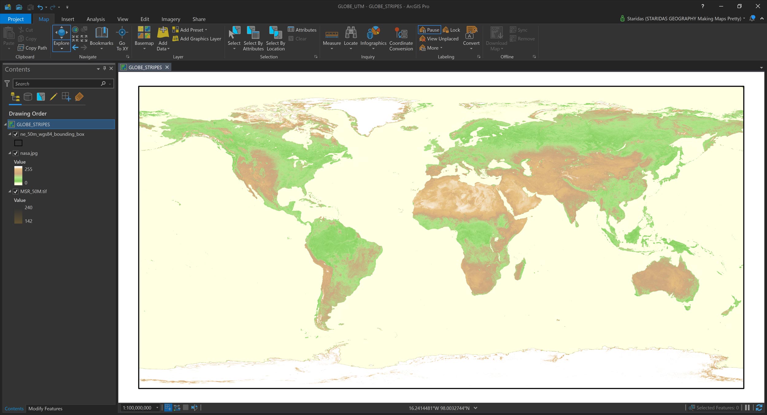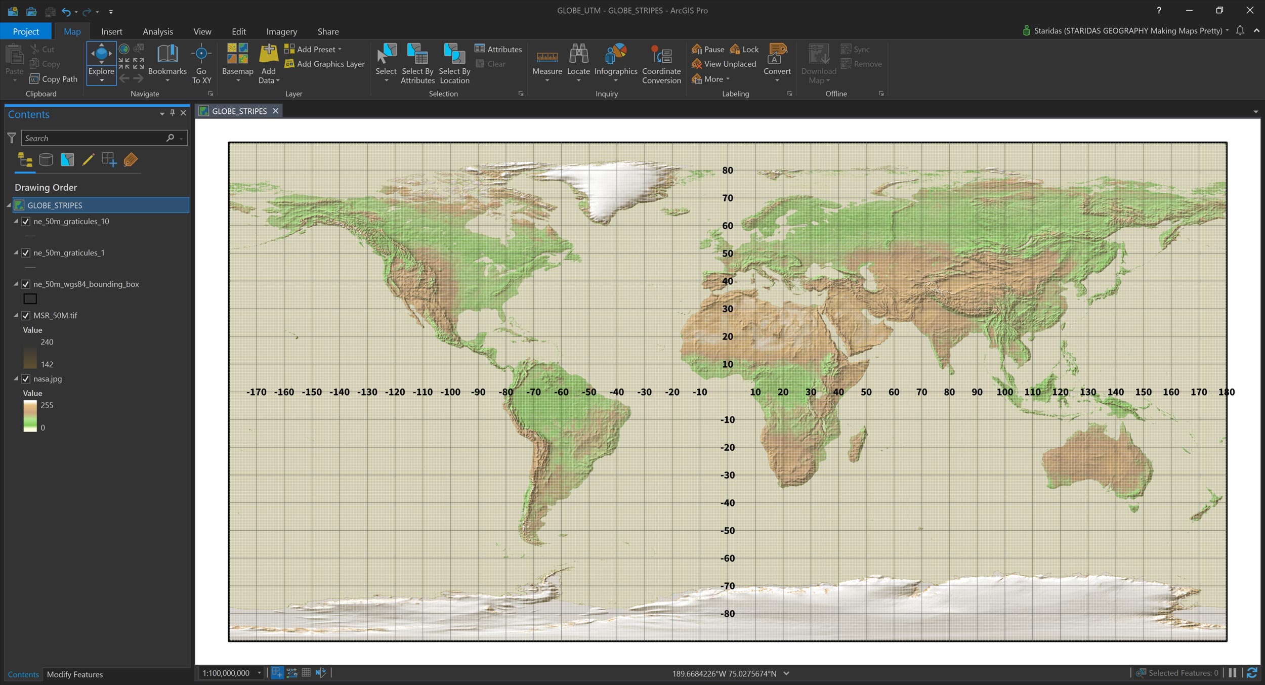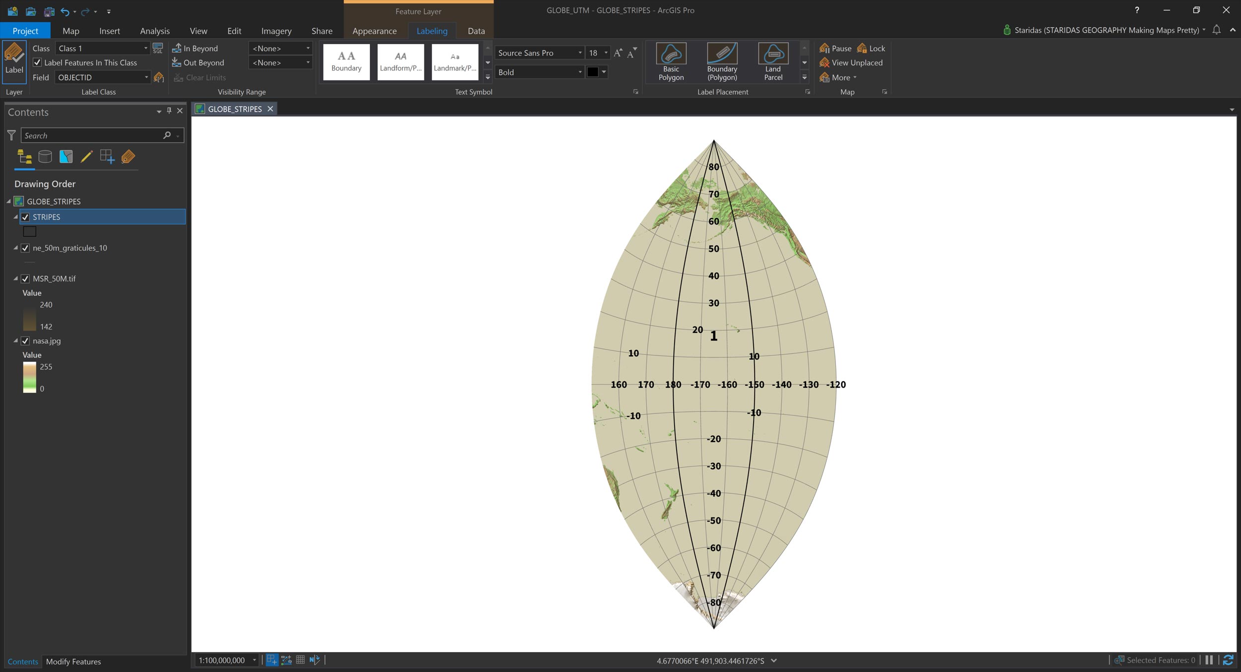 In ArcGIS Pro I create a new map which I rename to GLOBE_STRIPES. It will serve as the environment where I will prepare, process and create all necessary data. I turn the map projection to World Geodetic System 1984 (epsg:4326) and I load the World Bounding Box (Picture 5).