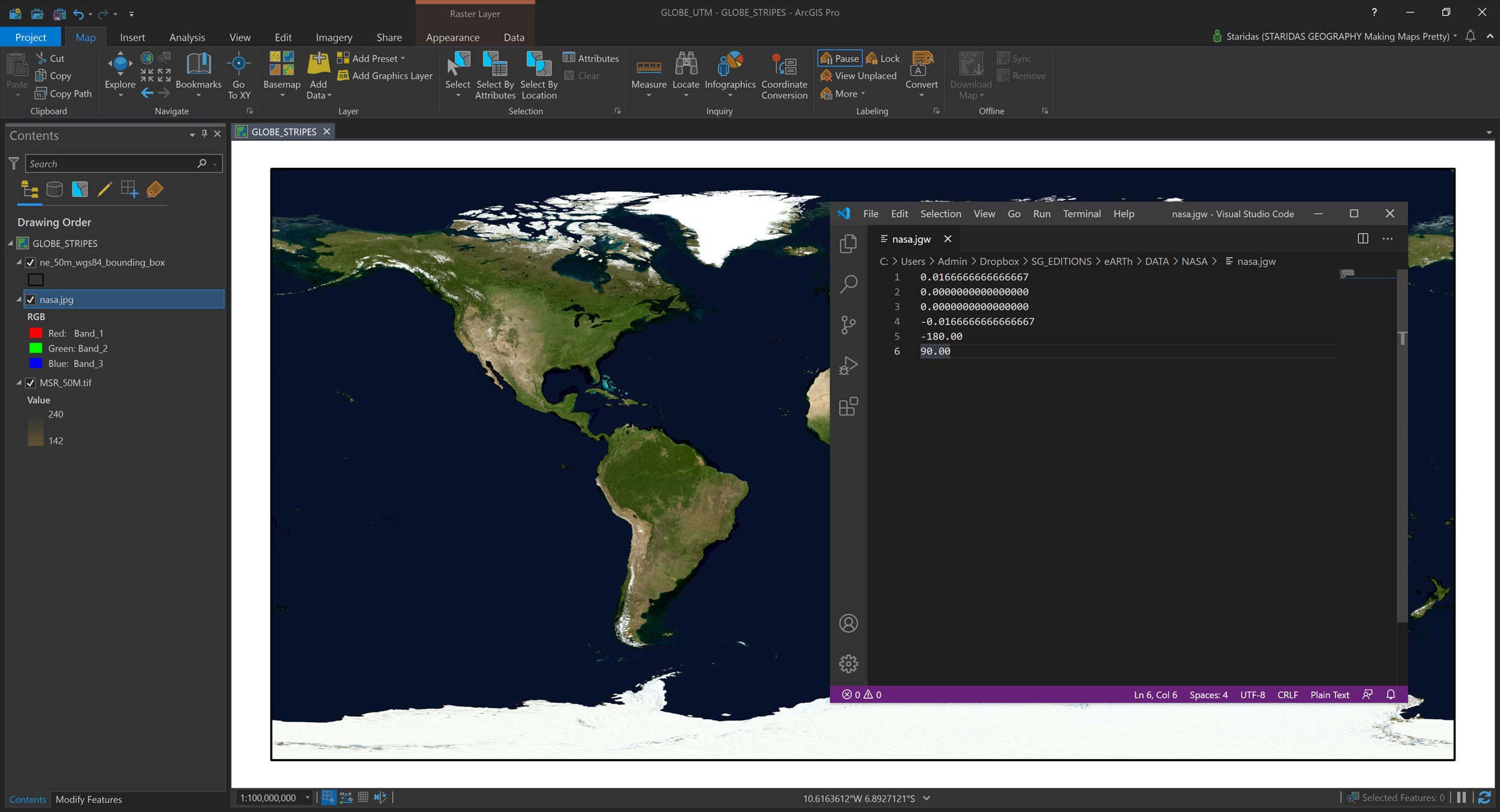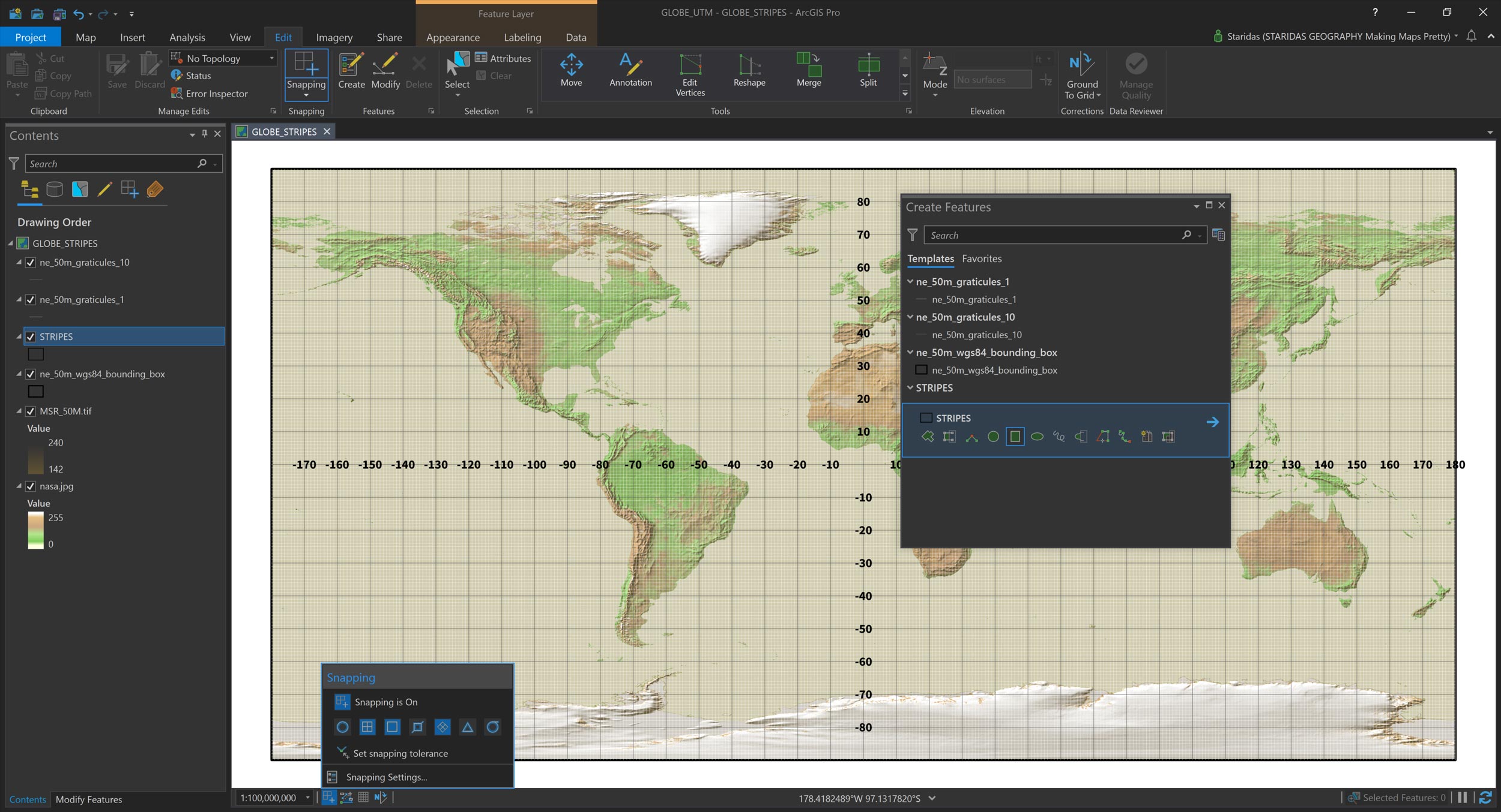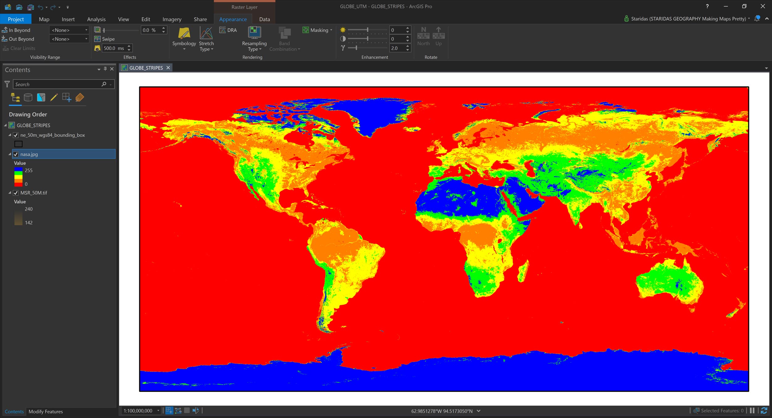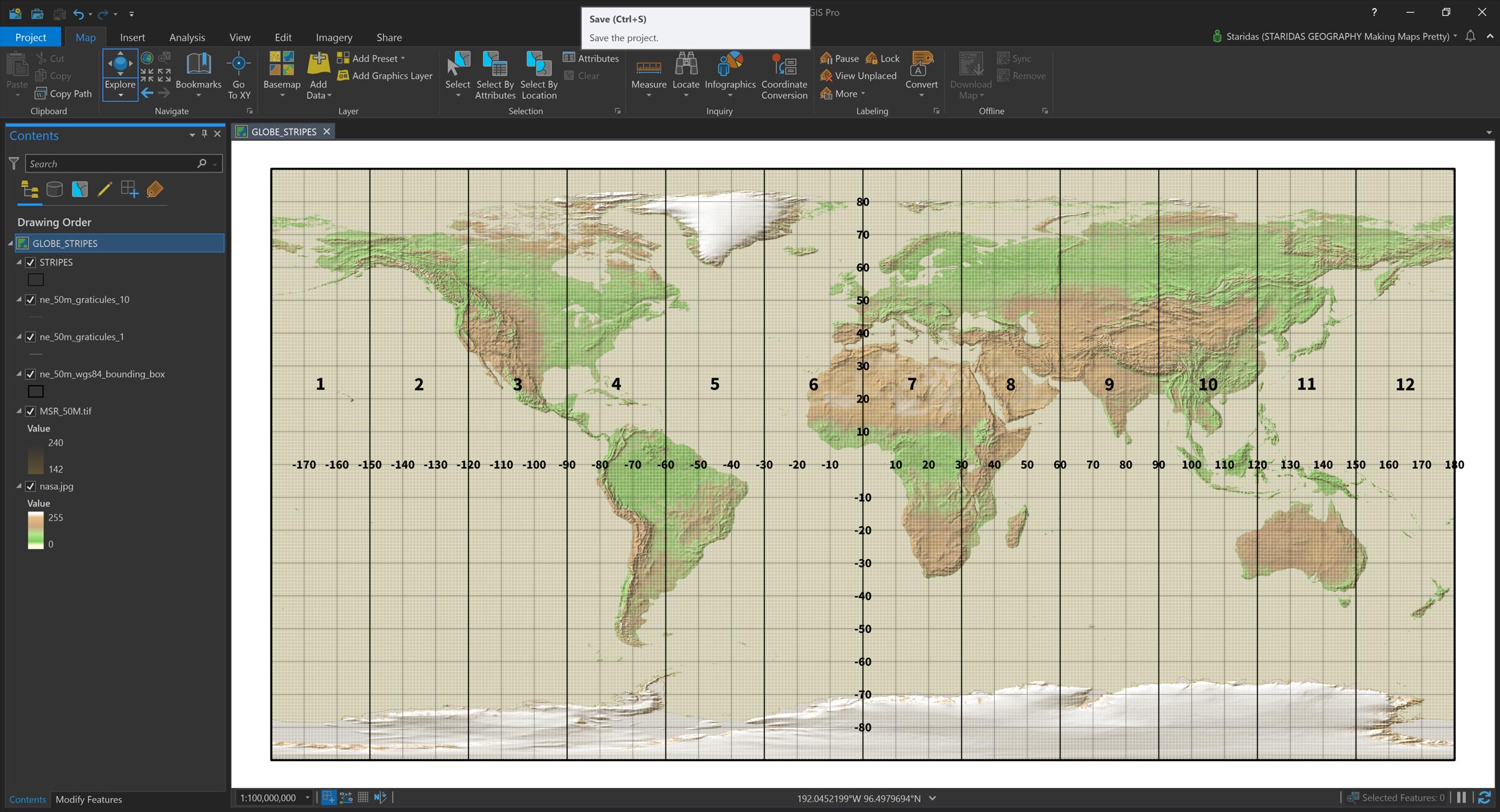 In ArcGIS Pro I create a new map which I rename to GLOBE_STRIPES. It will serve as the environment where I will prepare, process and create all necessary data. I turn the map projection to World Geodetic System 1984 (epsg:4326) and I load the World Bounding Box (Picture 5).