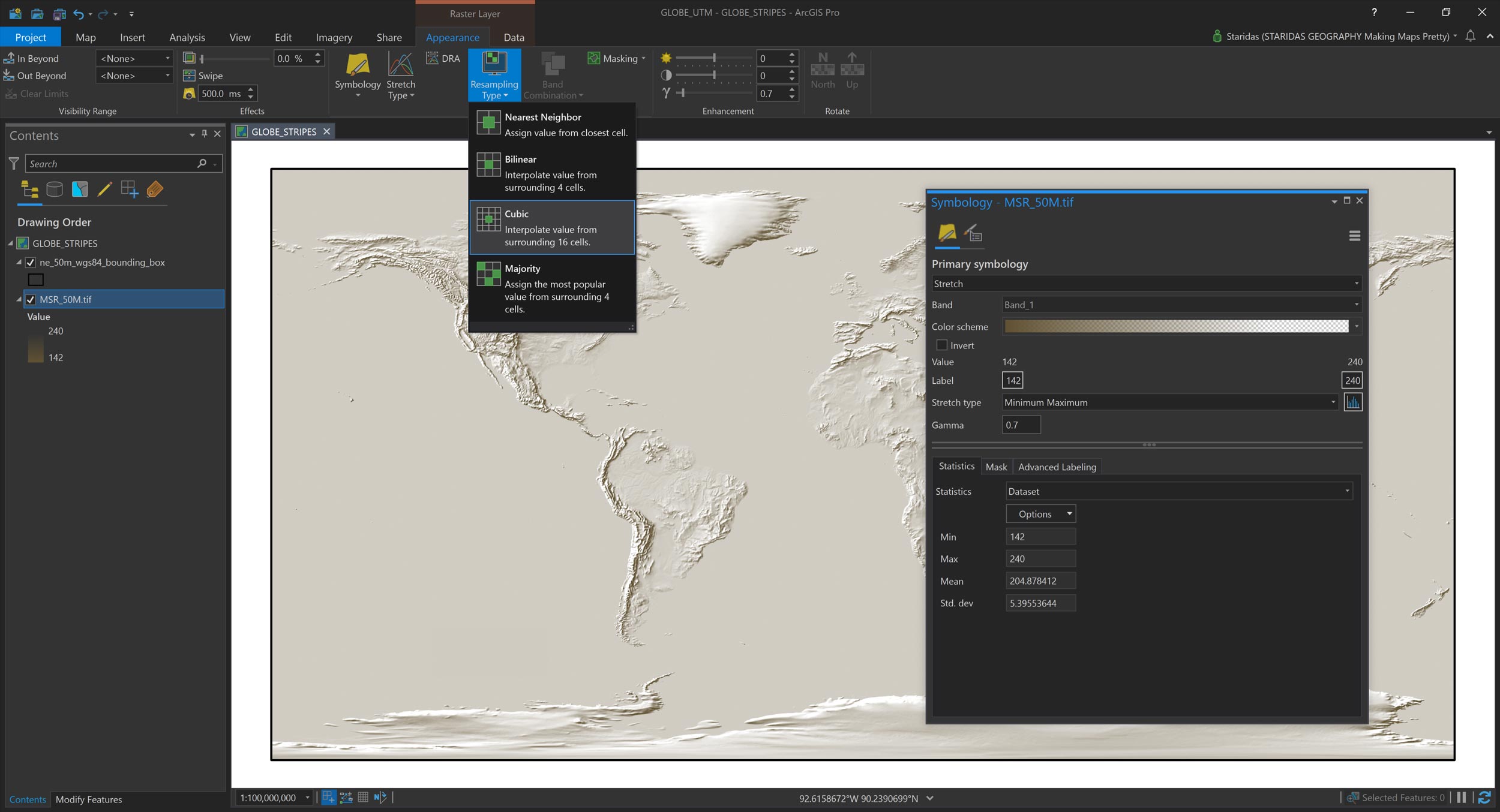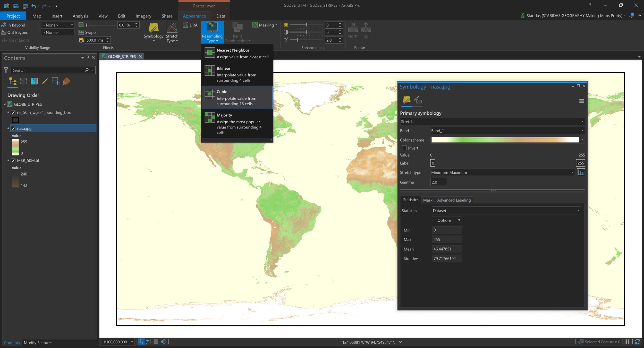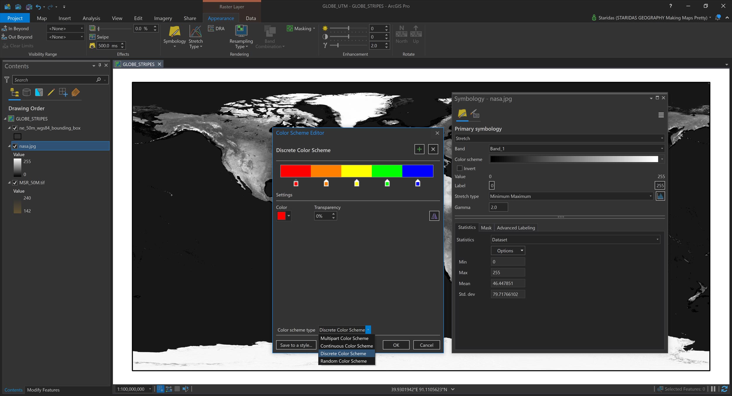 From the Appearance tab I open the Symbology panel for the NASA image. I select Stretch rendering instead of the default RGB, I select Minimum – Maximum for the Stretch type, I give a value of 2 for the Gamma parameter and I select a Discrete Color Scheme. I leave the default color scheme which includes five equally distributed discrete colors on the color ramp (Picture 10).