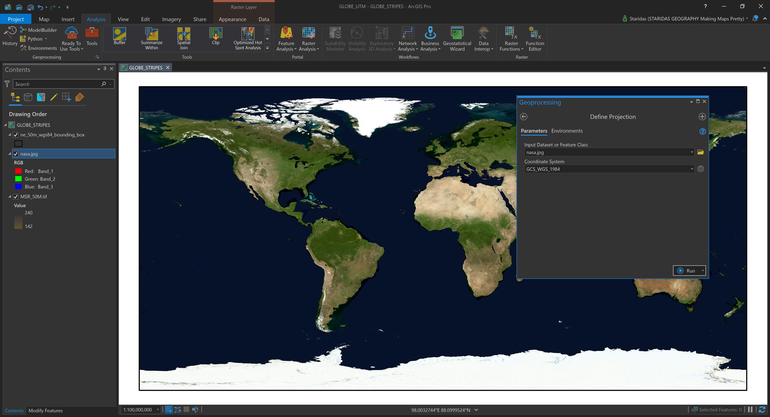 I now drag the image from its folder and drop it on the map in Pro. It fits perfectly to the World extent. Pro notifies me that its reference system is unknown, so I have to define it. To do this I simply open the Define Projection geoprocessing tool and I select the WGS84 from the drop down list of the available coordinate systems.