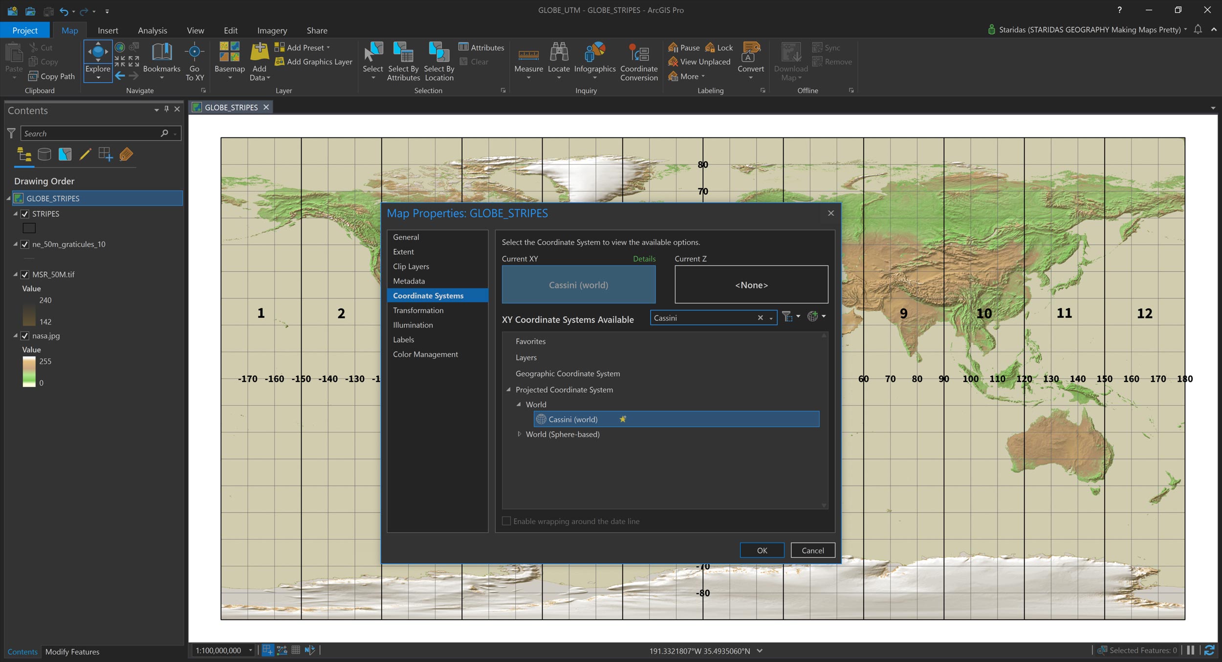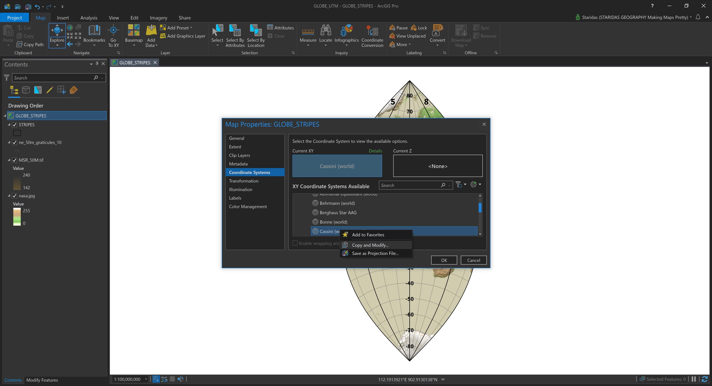 Time to change the coordinate system of the map. I used to apply a Transverse Mercator projection which worked perfectly, but after reading this magnificent blog post by John Nelson on how to Make this Cassini Globe Ornament I decided to try the suggested Cassini projection.