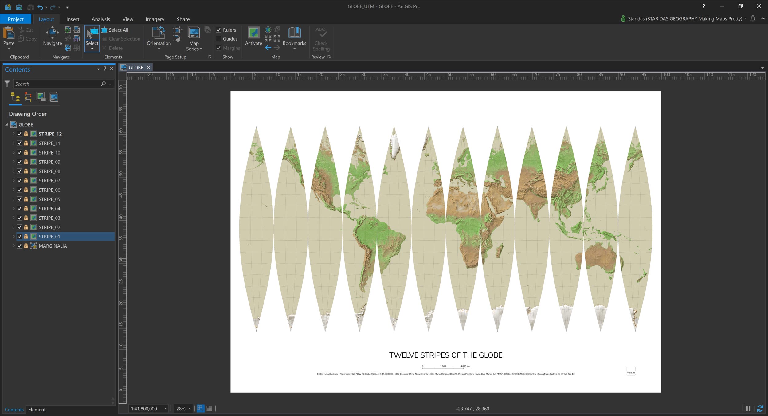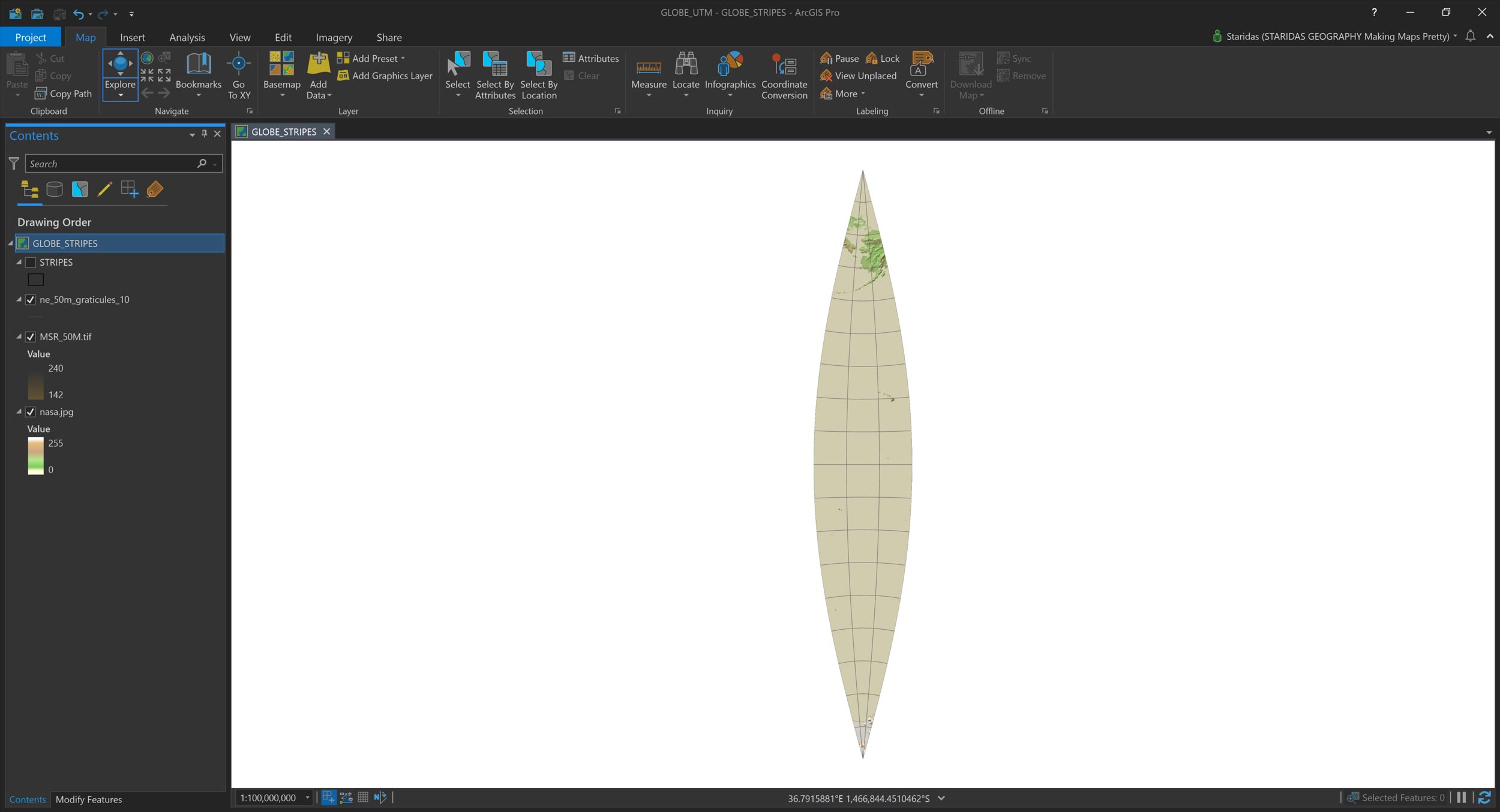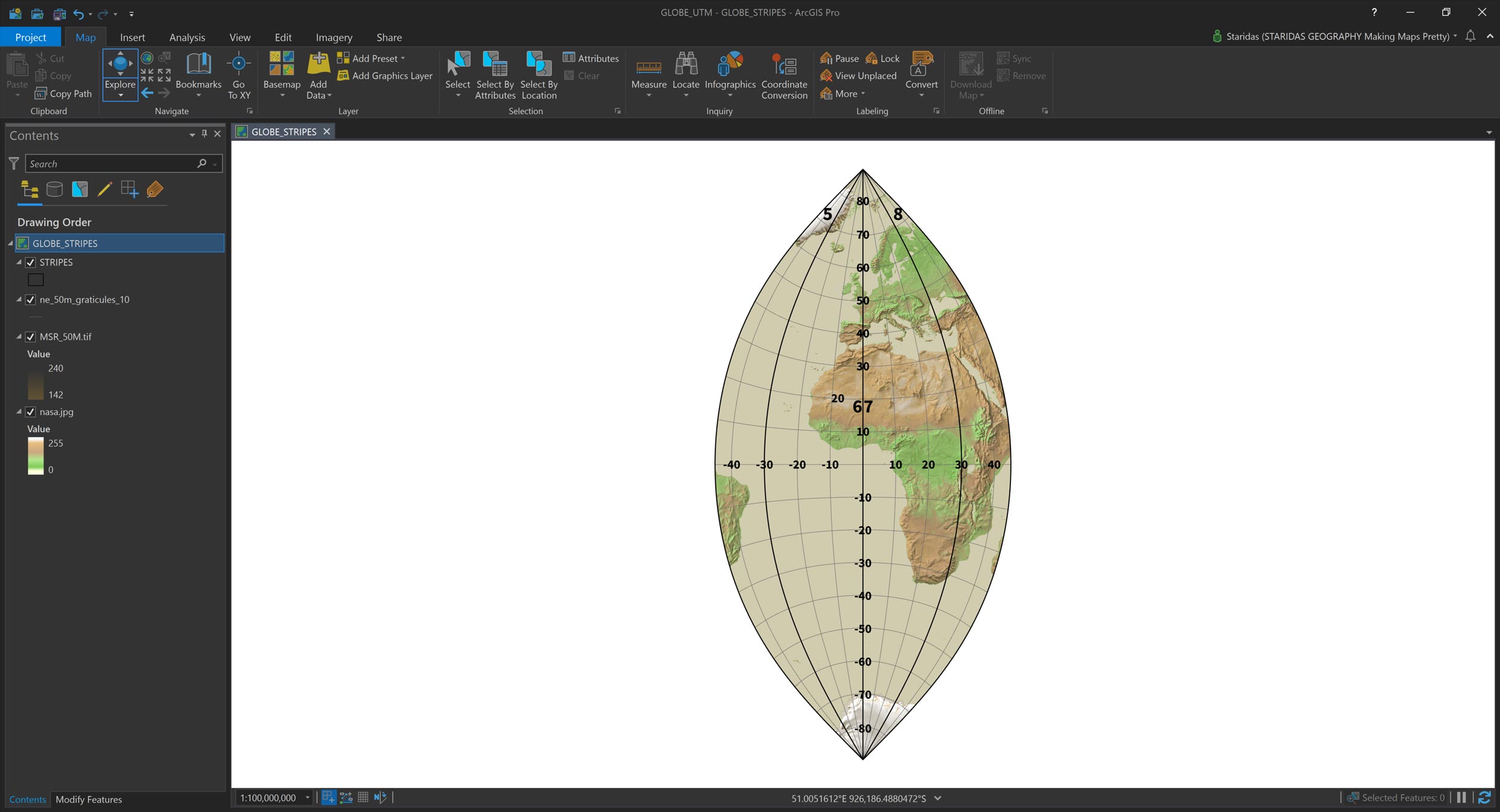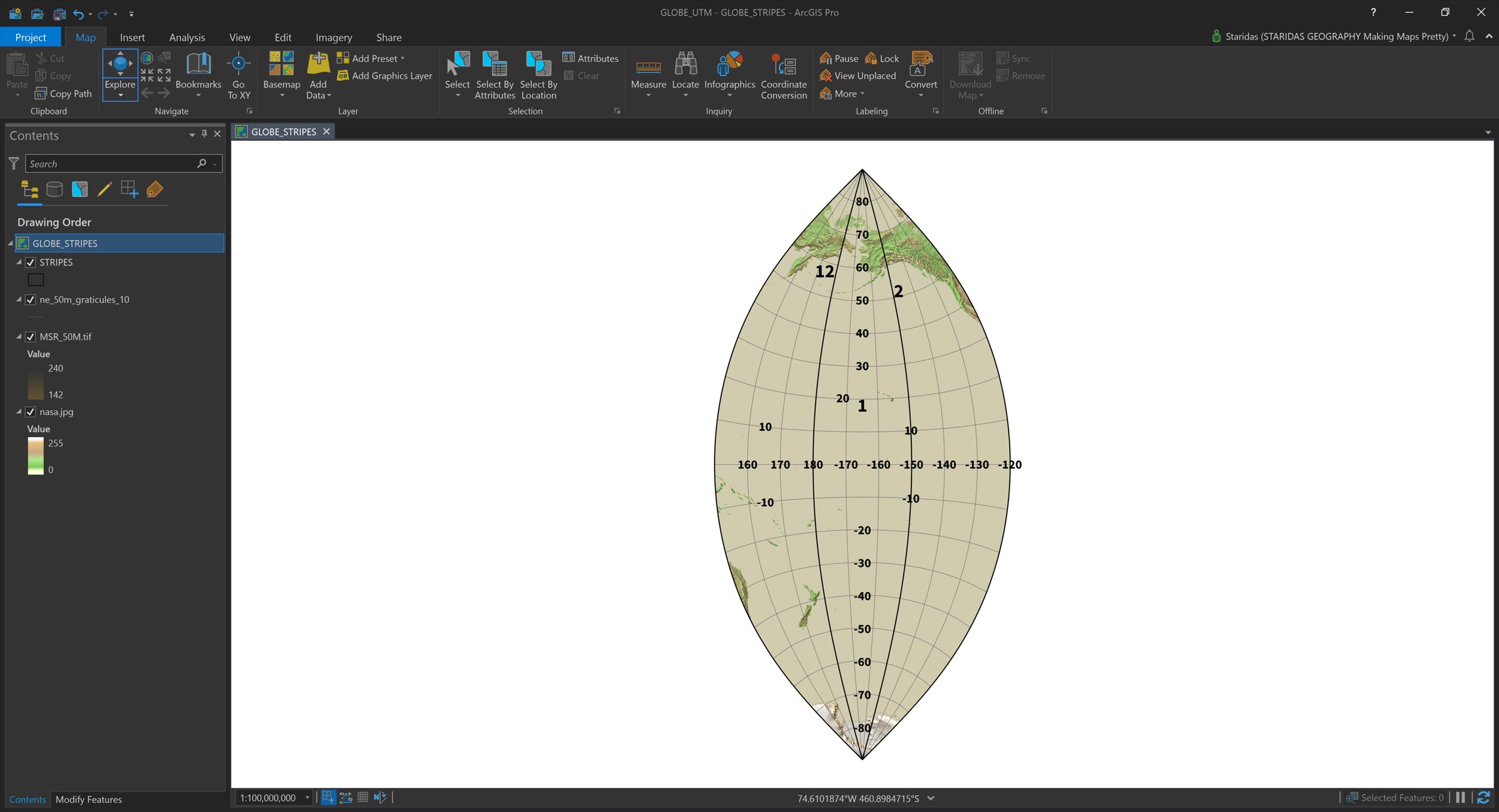 I remembered page 74 of the Map Use book by Esri Press where there is a whole paragraph about the Transverse Mercator projection and how it has been used by globe makers for centuries. I had also experimented a lot with globe gore production back in the ArcMap epoch, somewhere in between 2017 and 2018. I thought that reviving the technique of gore design and production, in order to participate at the 30DayMapChallenge event, would be the coolest idea I could find.