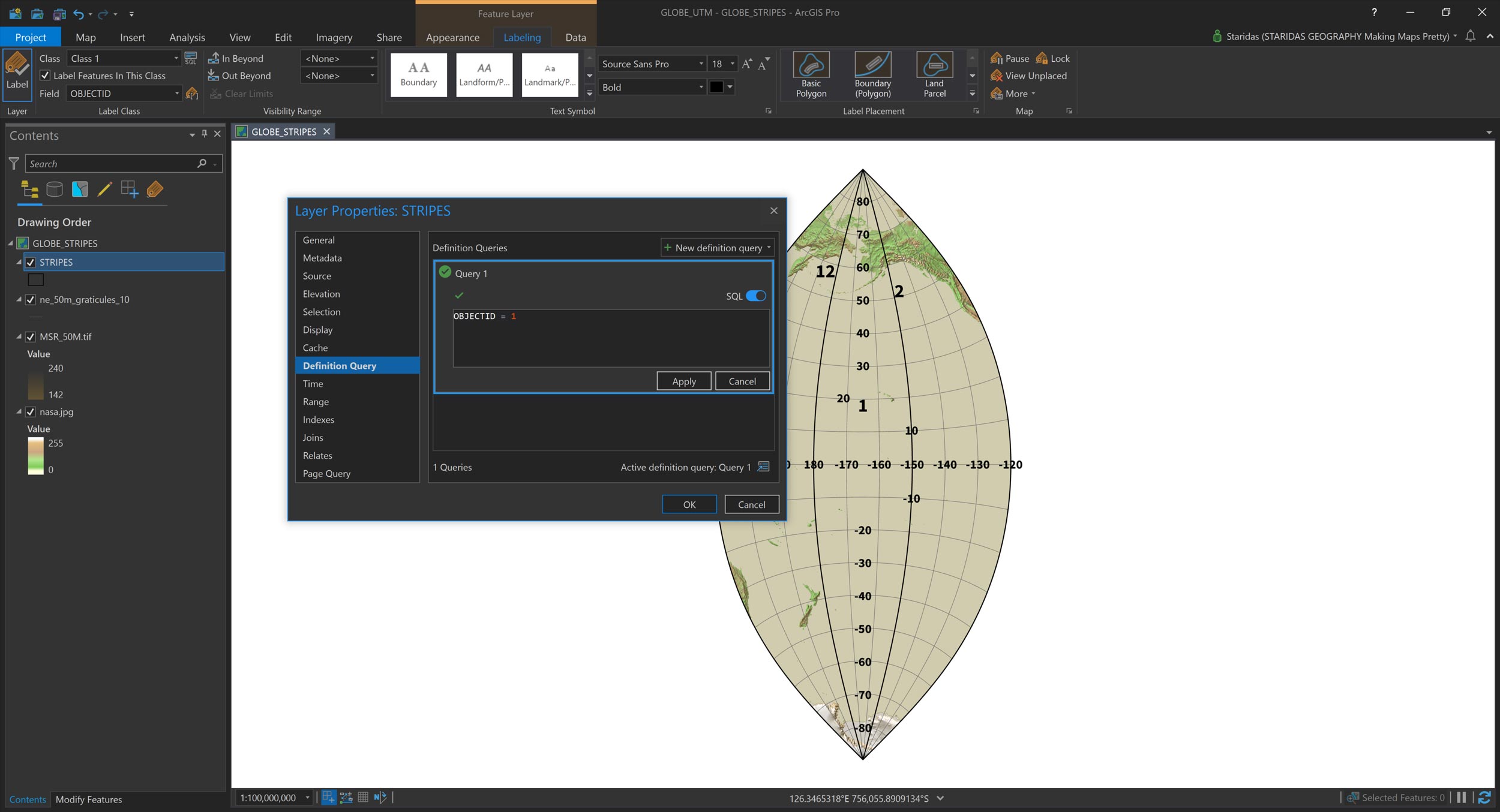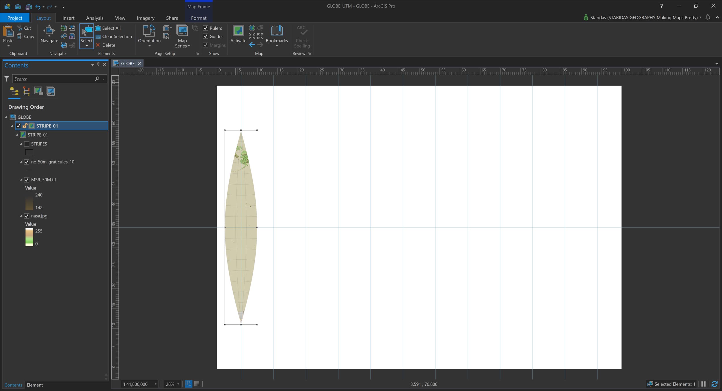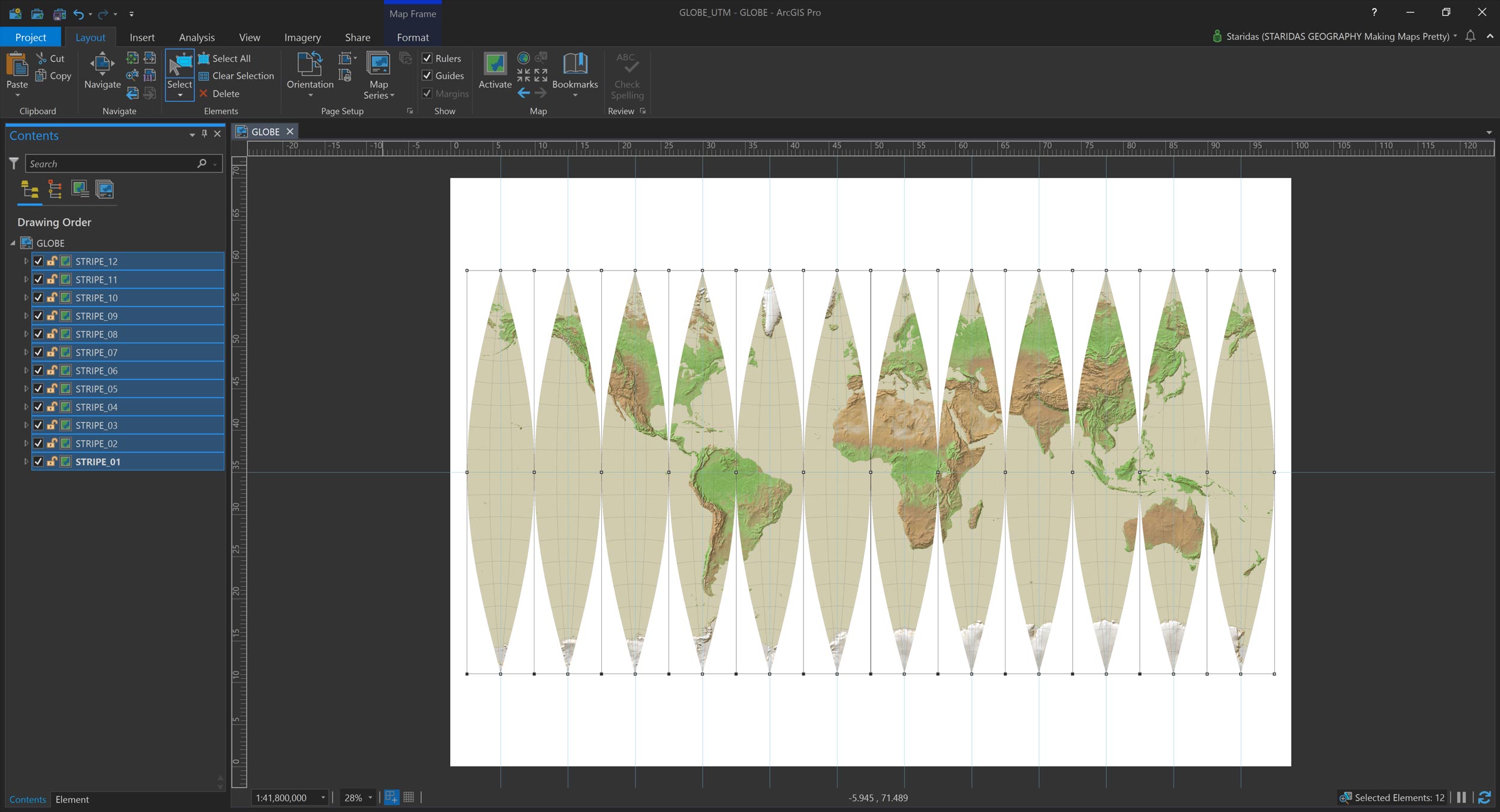 To produce all other eleven stripes I only have to copy the map eleven times and for each map to change the central meridian and of course to query the correspondent feature from the STRIPES layer (Picture 28).