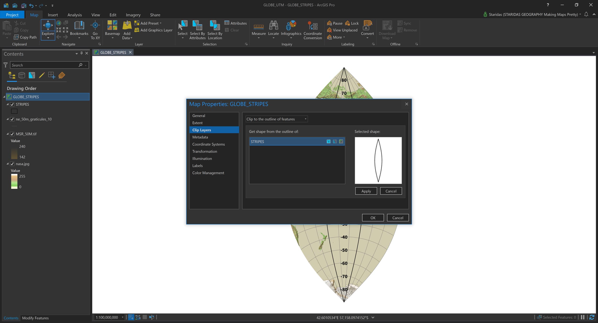 Back to the Map Properties, at the Clip Layers tab, I select the Clip to the outline of features option from the dropdown list and I select the STRIPES layer, which is limited to only one feature because of the query I performed (Picture 26).