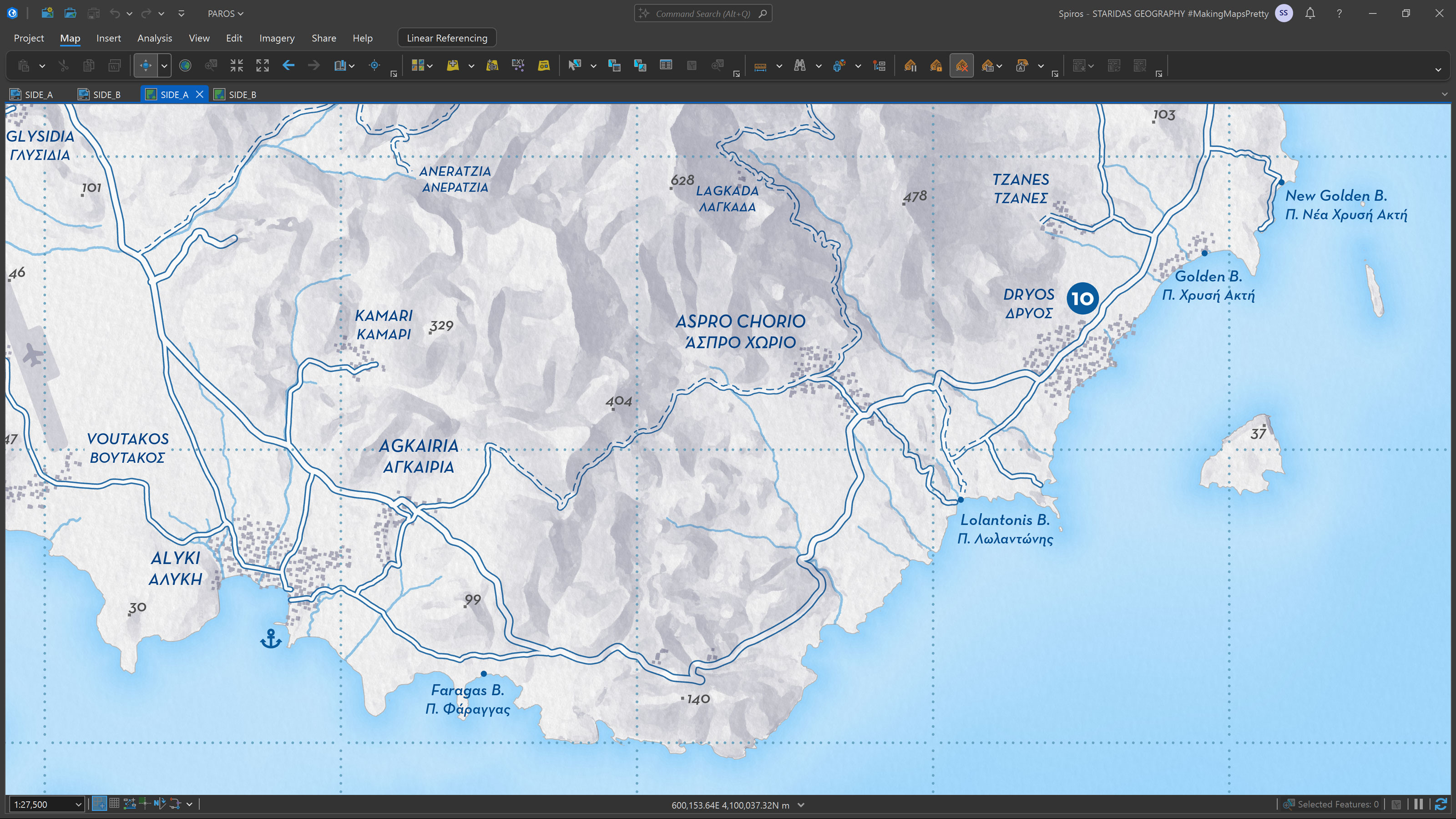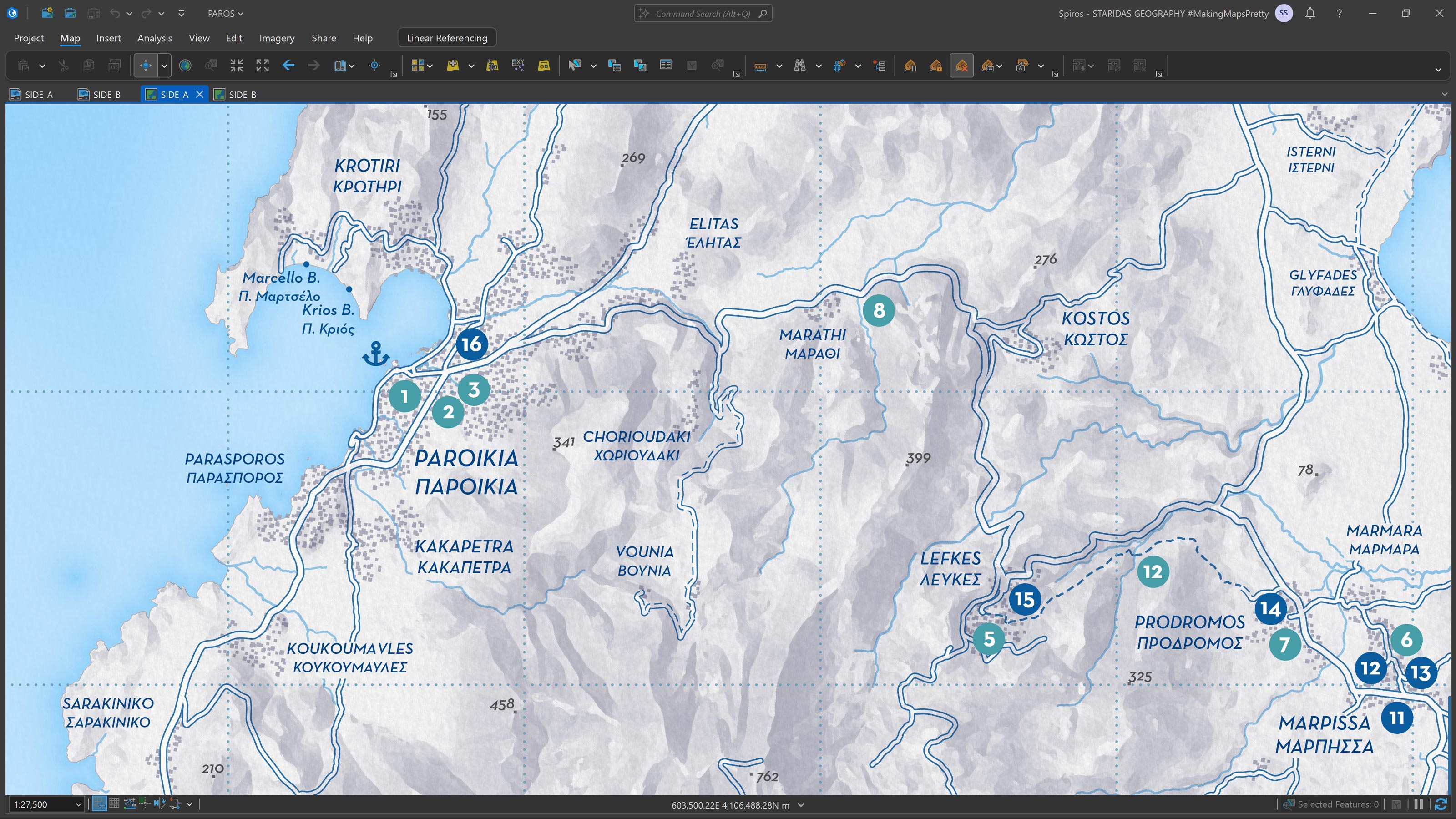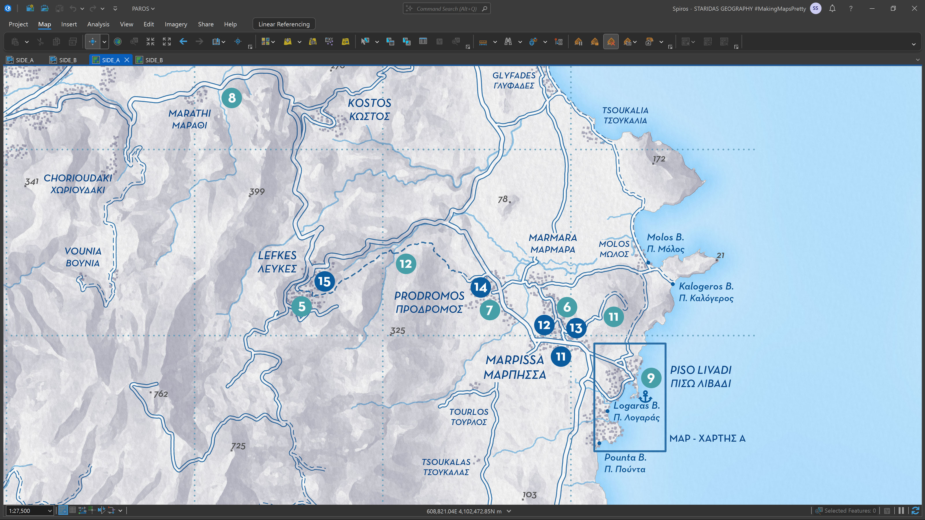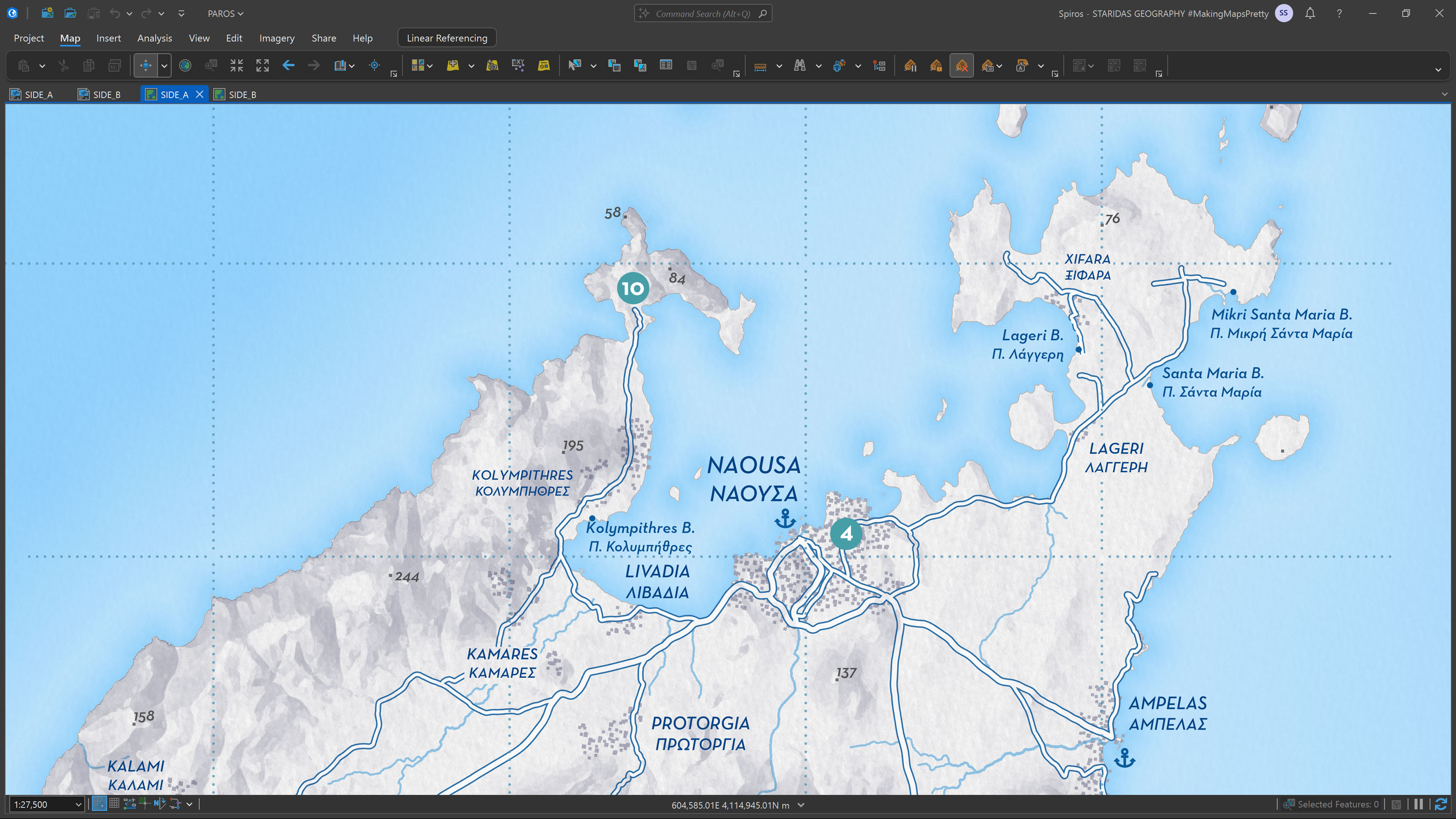 - The island-wide map of Paros island on the opposite side would be presented at 1:55,000, offering a broader view without sacrificing legibility.